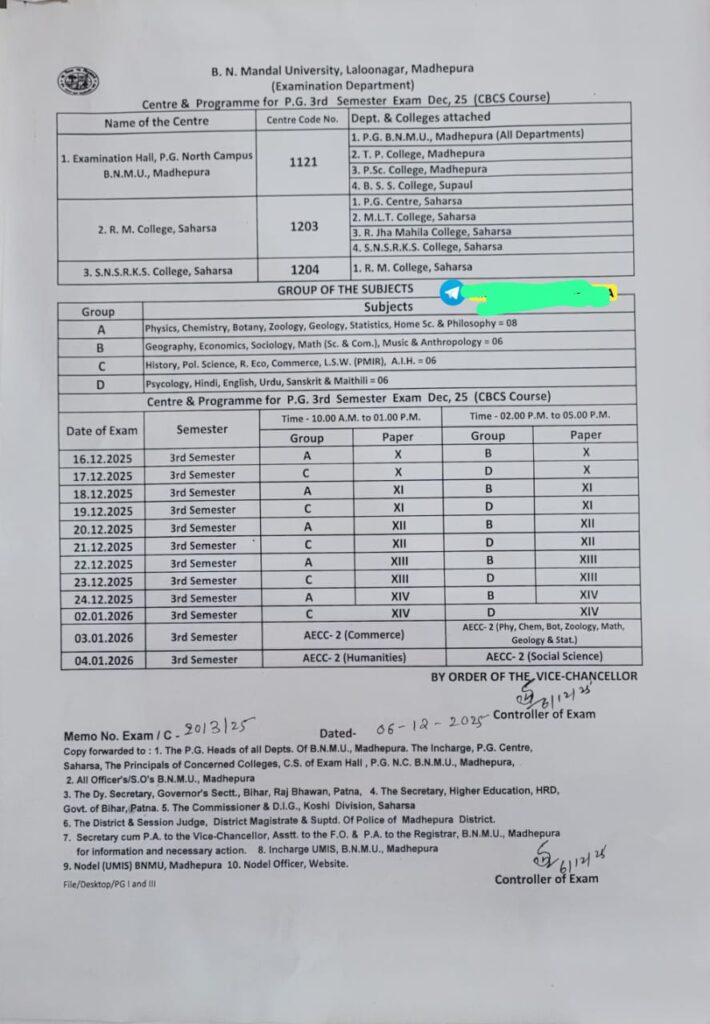 बी.एन. मंडल विश्वविद्यालय द्वारा जारी आधिकारिक नोटिफिकेशन के अनुसार पीजी थर्ड सेमेस्टर की परीक्षा 16 दिसंबर से शुरू होने जा रही है। परीक्षा ग्रुप-वाइज आयोजित की जाएगी, जिसमें सबसे पहले ग्रुप A के विषयों का एग्जाम होगा।
